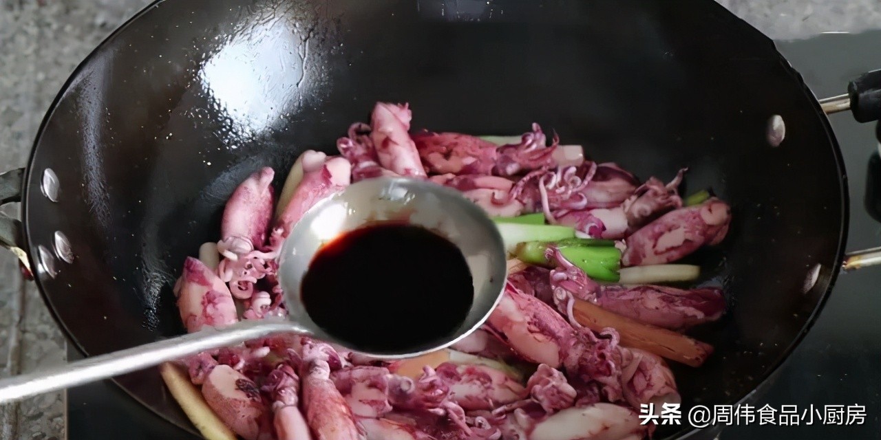 8、然后再沿着锅边淋入豆豉油激发出鱿鱼仔的香味,继续翻炒鱿鱼仔。