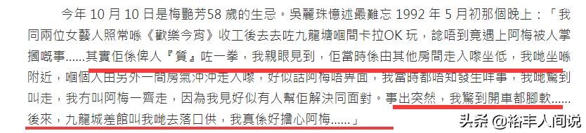 谈及到梅艳芳的事情,吴丽珠坦言当时梅艳芳被打了一拳,对方由另外一个房间怒气冲冲地走了出来,吴丽珠被吓蒙了,便想着叫梅艳芳一起走,但因为有好多人出面解决此事。事发太突然,事后吴丽珠开车仍然脚软。