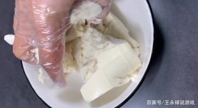 准备1块新鲜豆腐(先挑出旧豆腐),将其揉碎,放入碗中,然后,将韭菜洗净,待表面水分充分干燥后,再将其切成碎末,再将其倒入碗中,状态如上图所示即可。