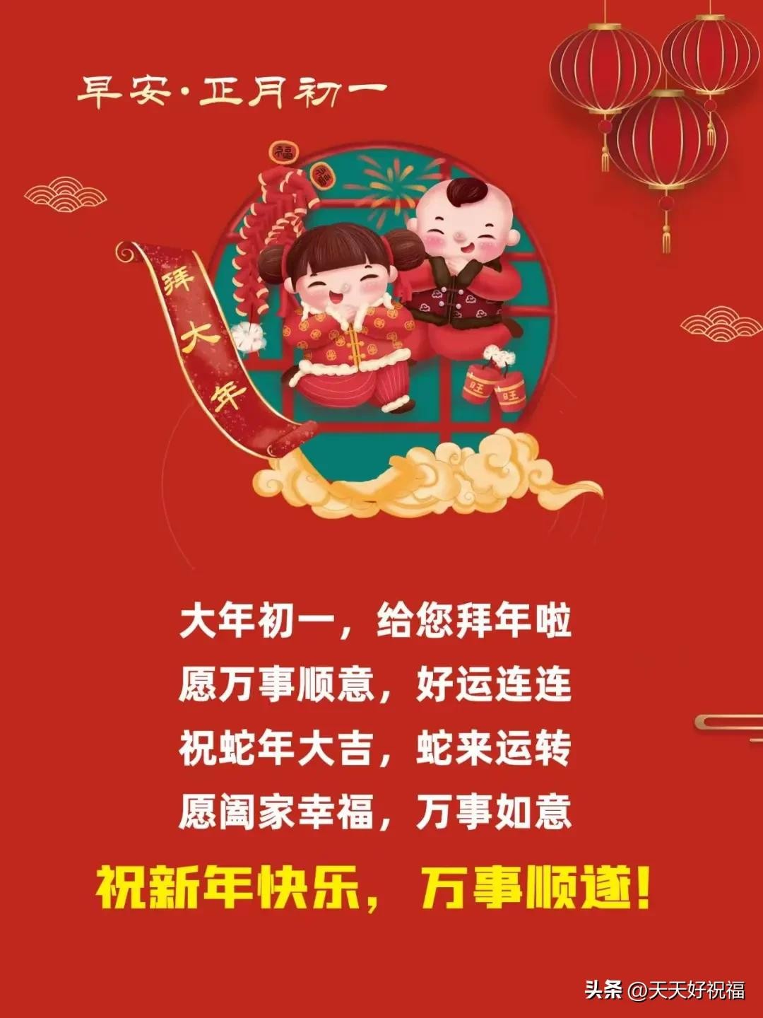 蛇年大年初一到,喜迎福运滔滔。祝你心想事成,财源广进,好运连连,事事顺遂,幸福美满,笑口常开,年年有余,身体健康,蛇年吉祥如意,快乐逢前。