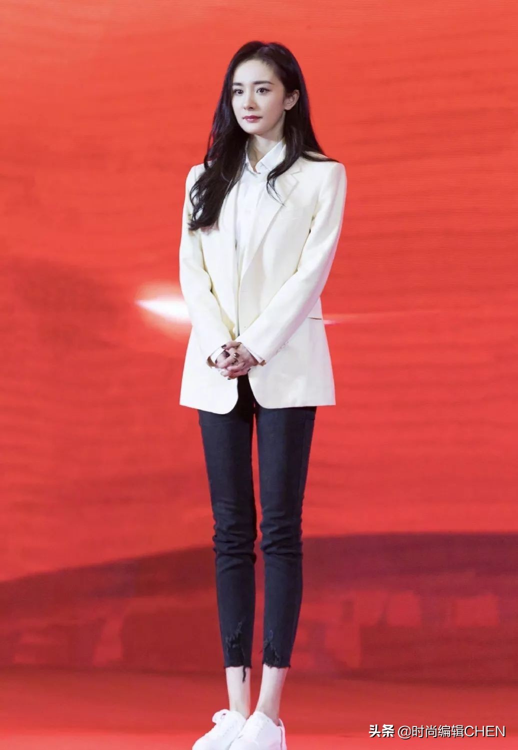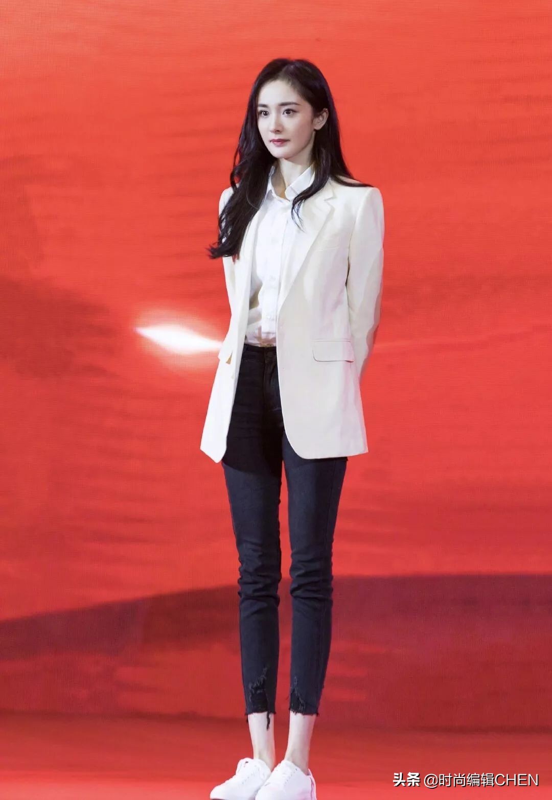 杨幂下身搭配的是一款八分的黑色牛仔裤,让西装有了更有趣的结构感,立刻吸了小编的眼球。超修身的黑色牛仔把杨幂下半身的腿形拉很好看,同时高腰+八分款式让比例也很出色。不过大冬天的露这么大一截脚踝,为了好看也是真够拼命的。黑白色系经典不易出错还对比强烈,是明星舞台款式的首选。这款西装是直筒款式的,相比有点收腰的这样的款式更时尚洋气。对于苹果型身材的人来说也是很友好的,本身西装面料硬挺有质感,可以修饰掉腰部两侧的肉还不被发现。这次活动中马伊琍穿搭有些失策,西装配拖地裤成150cm,撞上杨幂同穿西装被碾压。