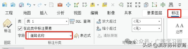 (1)加载数据文件,点击“标注”菜单栏,找到“标注分类”面板中的“字段”选项,选择需要标注的“道路名称”字段。