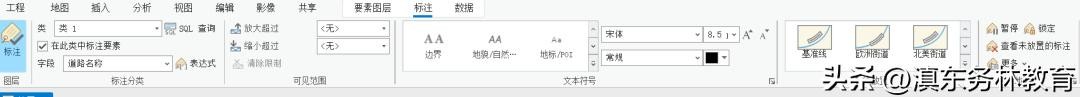 最后,标注的很多设置都能在面板中直接选择,就像office软件一样,可以面板式操作,相比ArcGIS而言,操作起来要方便多了,以下是标注设置在面板中的功能选项。