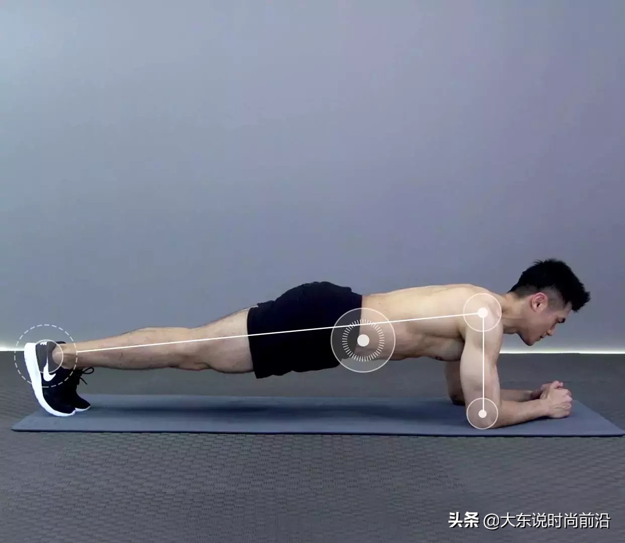 1.双肘在双肩落点下,肩甲与背部呈平面,身体不能过低或者过高;