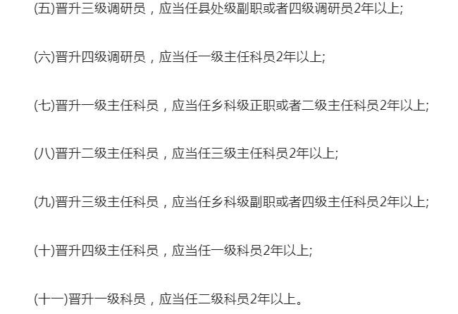 大家都知道公务员的职级晋升也是有一定的条件,晋升不同的层级需要的条件也不一样,同时对于任职年限也有一个基本的限制,让我们来看看相关规定中对于任职年限的一个最低要求,具体如下图
