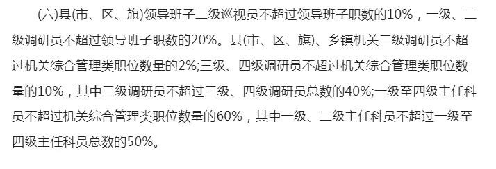 从上图来看,一至四级主任科员不能超过总人数的60%,也就是还有40%的人可能无法跻身到科级干部这个序列。再加上领导层面也要占用一部分名额,真真正正能分给普通人员的廖廖无几。因此在名额分配上还望有待出台政策进行进一步优化,这样才能让该政策造福更多的基层人员。