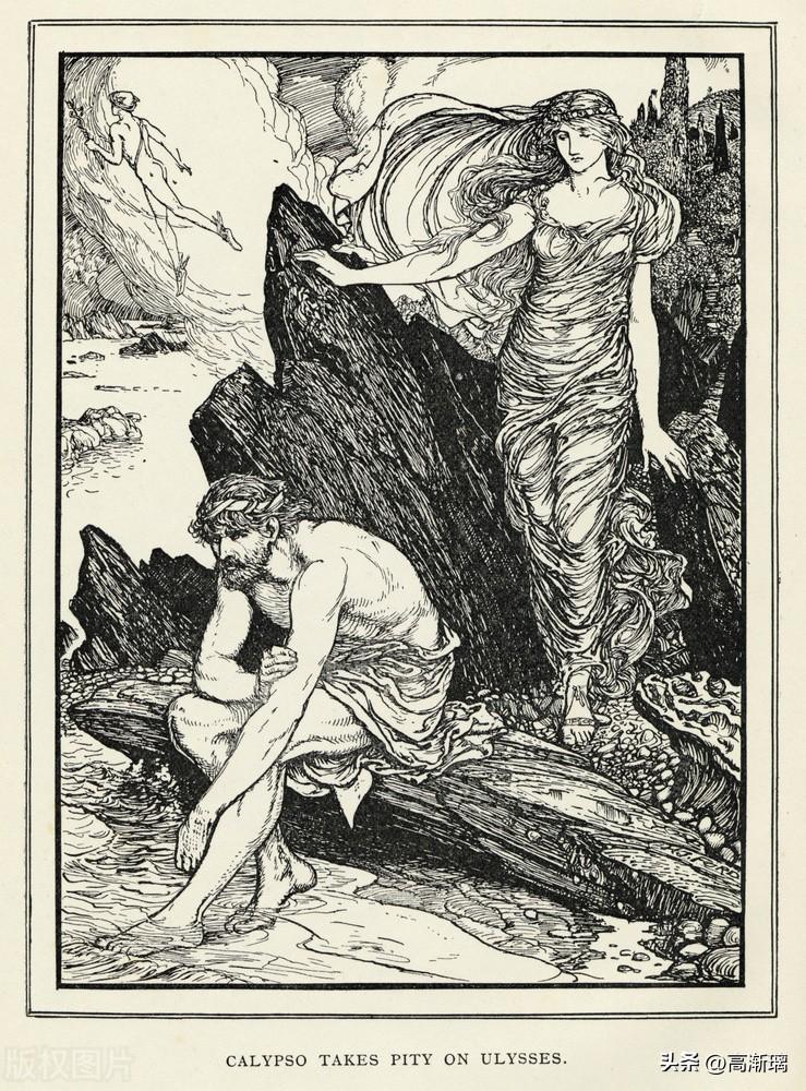 当然,奥德修斯经历的最大的诱惑来自女神卡吕普索。当奥德修斯失去所有伙伴,独自漂流到奥吉吉亚的海岸,是卡吕普索把他救起。
