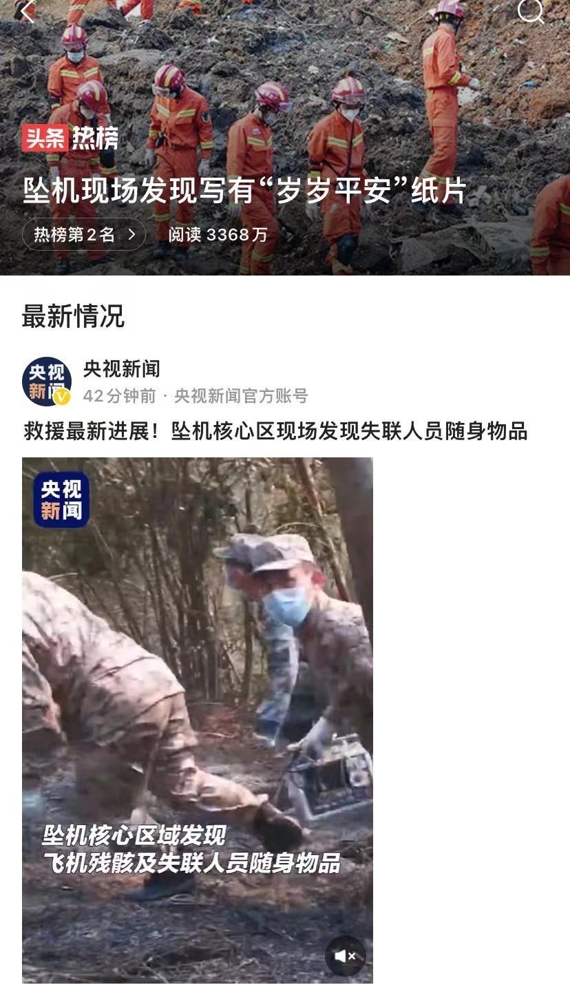 此时的飞机坠毁现场,应急、消防等多方力量组成的搜救队仍在进行紧张的搜救...