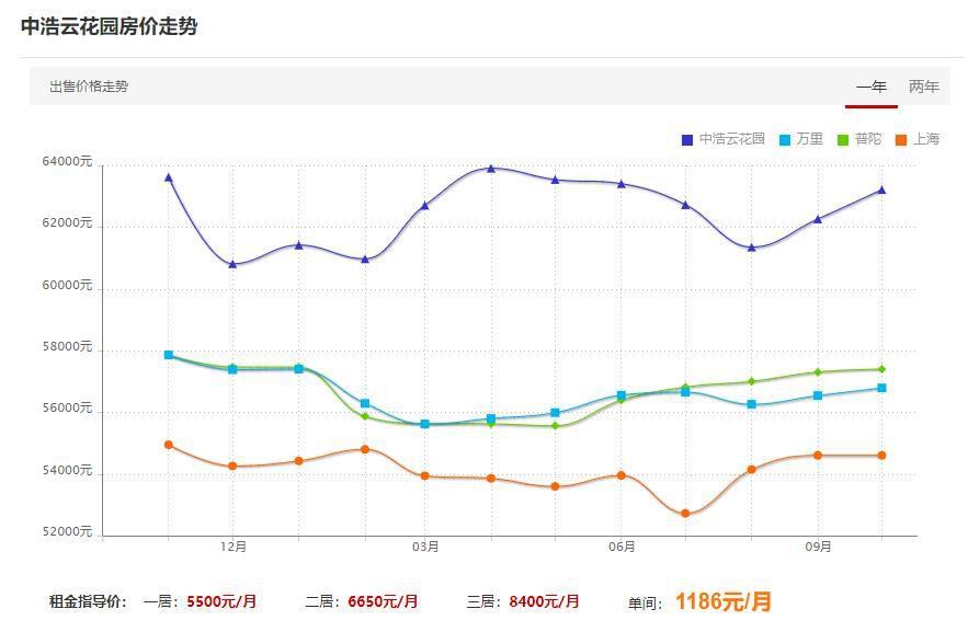 中浩云花园近一年成交以二房为主,今年以来,出售价格基本稳定在6.1-6.4万/㎡,三四月“小阳春”和“金九银十”价格稍有抬头。