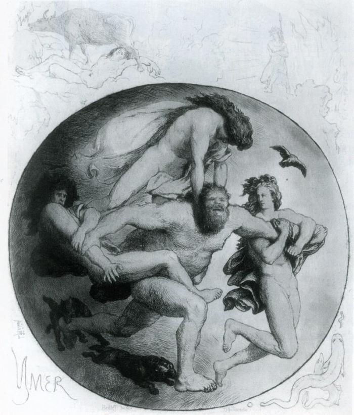 之后,尤弥尔分别从左右的腋窝中诞下了智慧巨人密米尔(Mimir)和女巨人贝斯特拉(Bestla),而她的双腿则诞下一个六头的怪物。另外,在母牛的舔舐下,冰中出现亚萨神族之祖布利(Buri)。布利生下包尔(Borr),包尔和女巨人贝斯特拉(Bestla)生下了奥丁(Odin)、威利(Vili)、菲(Ve)。巨人族和诸神相当不合,双方挑起战火。后来尤弥尔被诸神所杀,巨人族战败,剩下的巨人逃往约顿海姆(Jöthuheim),并继续对诸神抱持着恨意。