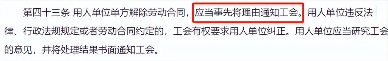 第四十三条相关规定:用人单位单方面解除劳动合同,应当事先将理由通知工会。