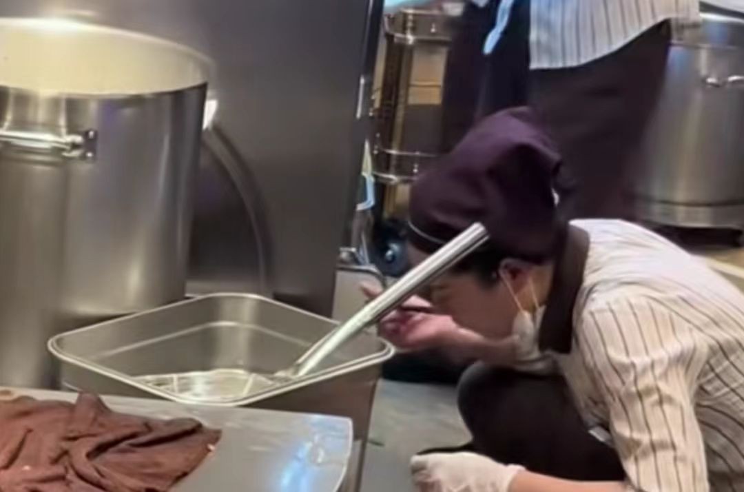 根据视频显示:一美食城年轻女员工蹲下悄摸尝面后,带上口罩,随后把未清洗的筷子放在在锅里搅拌。