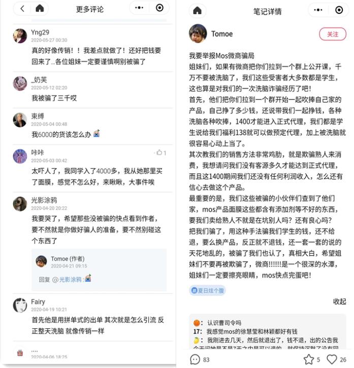 5月28日,有网友发文成为MOS微商代理的不幸经历,该网友李丽(化名)提到,自己在抖音上刷到MOS逆袭视频,于是在视频下方留言如何瘦,随后有人私信该网友并把微信推给李丽,李丽半信半疑的加了,对方的减肥产品是358元一盒,李丽表示该产品并不便宜,但是使用完一盒之后并没有任何效果,但MOS的代理商却让李丽再买一盒,由于李丽太想瘦下来了,于是借钱又买了一盒,然而使用两盒还没有效果,李丽有些着急了,但是对方让李丽成为MOS的代理商,能够自用省钱,并且强调自己没加入MOS之前也没钱,但是如今做了代理商之后如何有钱有地位。