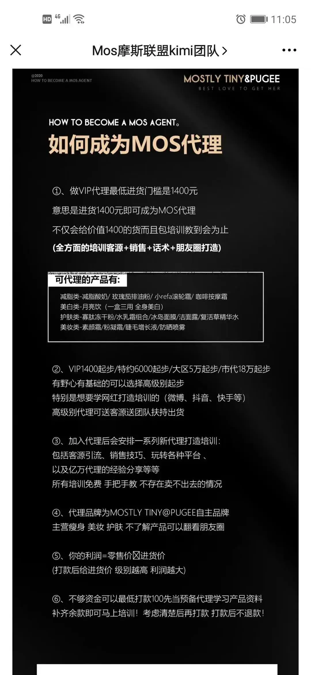 李丽家庭条件并不好,但是为了能够给母亲减少经济负担,有些心动,但李丽也非常明白做微商代理的风险并不低,而对方表示所有培训都不要钱,而且能够帮她引流并保证能出单,对方还表示自己团队如何强大。于是李丽借钱加入MOS成为代理。