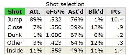 15-16赛季,JR场均12.4分,每场比赛能命中2.2个三分。但是他的得分方式真的挺让人诧异的。跳投占比89%,,其余的方式,诸如扣篮、上篮等占比都非常之少。