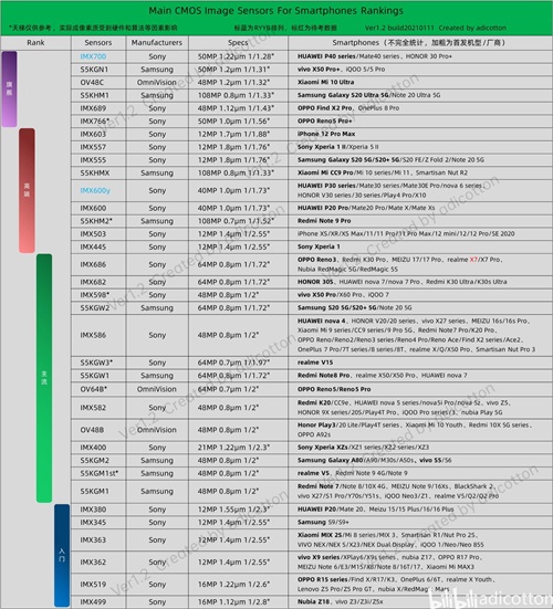 一、5000万索尼IMX700(代表机型 P40 PRO+、华为Mate 40 Pro+等)