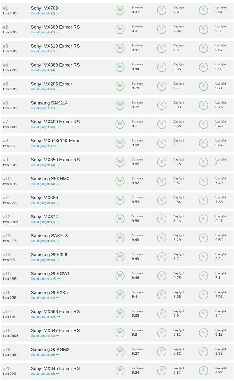 各大手机厂商机型摄像头CMOS 排行榜