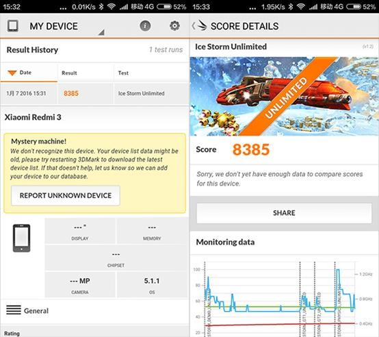 而在注重3D图形性能的3Dmark测试中,在Ice Storm Unlimited模式中,可以跑到8385分,从跑分上来看基本可以满足日常游戏应用的需求。我们再用《狂野飙车8》和《真实赛车3》来实际测试下红米3。