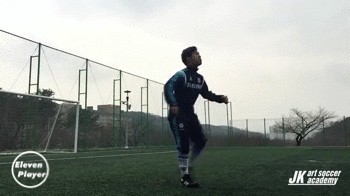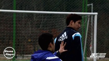 ▼实战中接队友传中之后的倒钩,注意示范队员的落地姿态。