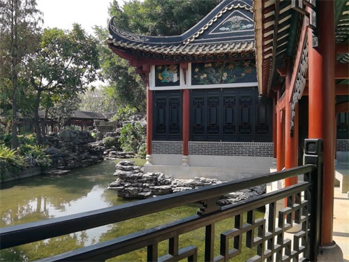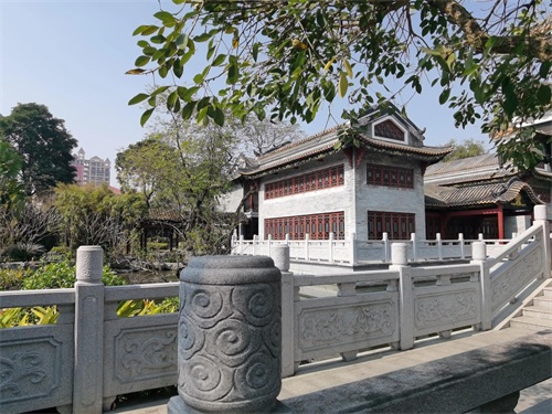 漫步园内,映入眼帘的是一片片精巧的岭南园林建筑。这些建筑依水而建,错落有致。白墙黛瓦,飞檐翘角,每一处都透露出浓厚的岭南风情。阳光透过轻纱似的雾霭,洒在湖面上,波光粼粼,美不胜收。