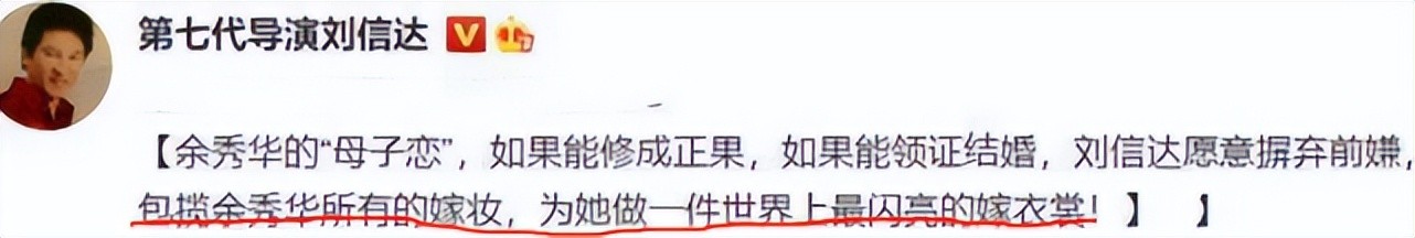 还有此前一直蹭余秀华热度的刘信达,声称如果他们结婚的话,就包揽余秀华所有的嫁妆,给她做一件世界上最闪亮的嫁衣。