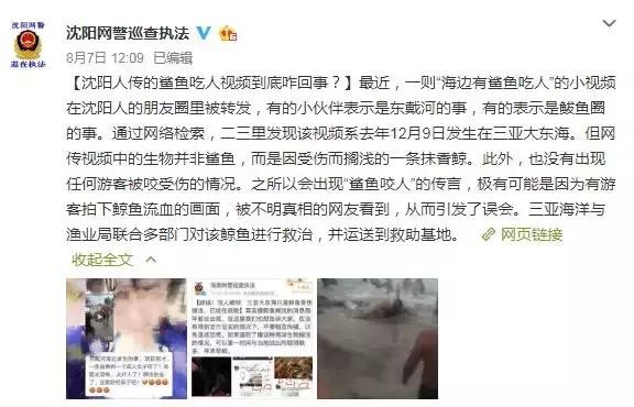 随着视频在各地的流传,8月7日沈阳警方官方辟谣,该视频是去年12月9日发生在三亚大东海,没有出现任何游客被咬受伤的情况;之所以会出现“鲨鱼咬人”的传言,极有可能是因为有游客拍下鲸鱼流血的画面,被不明真相的网友看到,从而引发了误会。