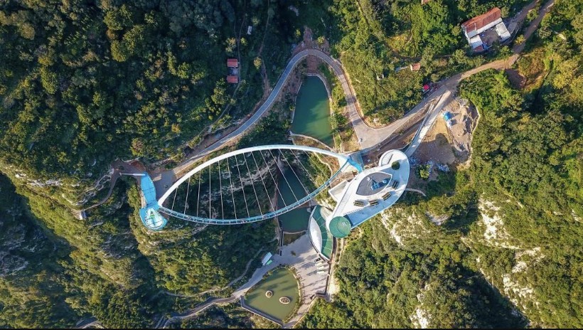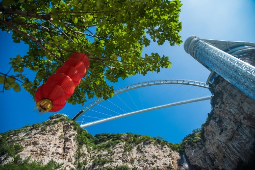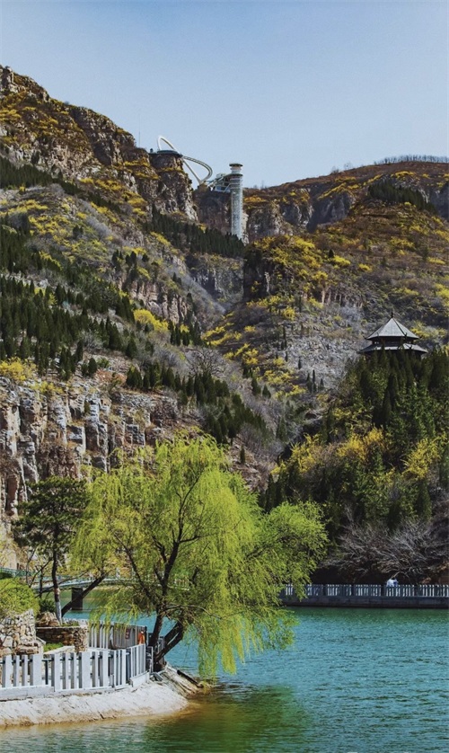 除了历史遗迹,这里还建有世界首座无背索斜拉玻璃桥、山东首部百米观光电梯(上图),成为淄博市代表景区之一。如今的潭溪山一年四季,各有神韵,春赏花,夏玩水,秋赏红叶,冬观冰瀑,给世人提供了一处回归自然、放松心灵的旅游胜地。