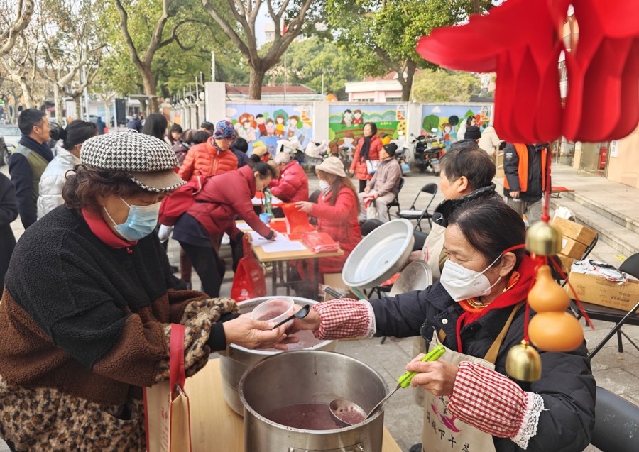 金山区石化街道海棠小区志愿者将一碗碗热腾腾的腊八粥递到居民手中