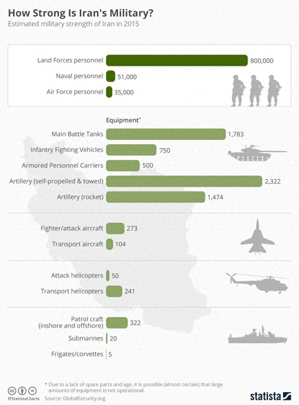 伊朗武装部队是中东地区最大的军队。 伊朗军队由大约 610,000 名现役人员和 350,000 名预备役和训练有素的人员组成,这些人员可以在需要时被动员起来,使该国军事人力总和达到大约 960,000 人。这些数字不包括执法司令部或巴斯基民兵。