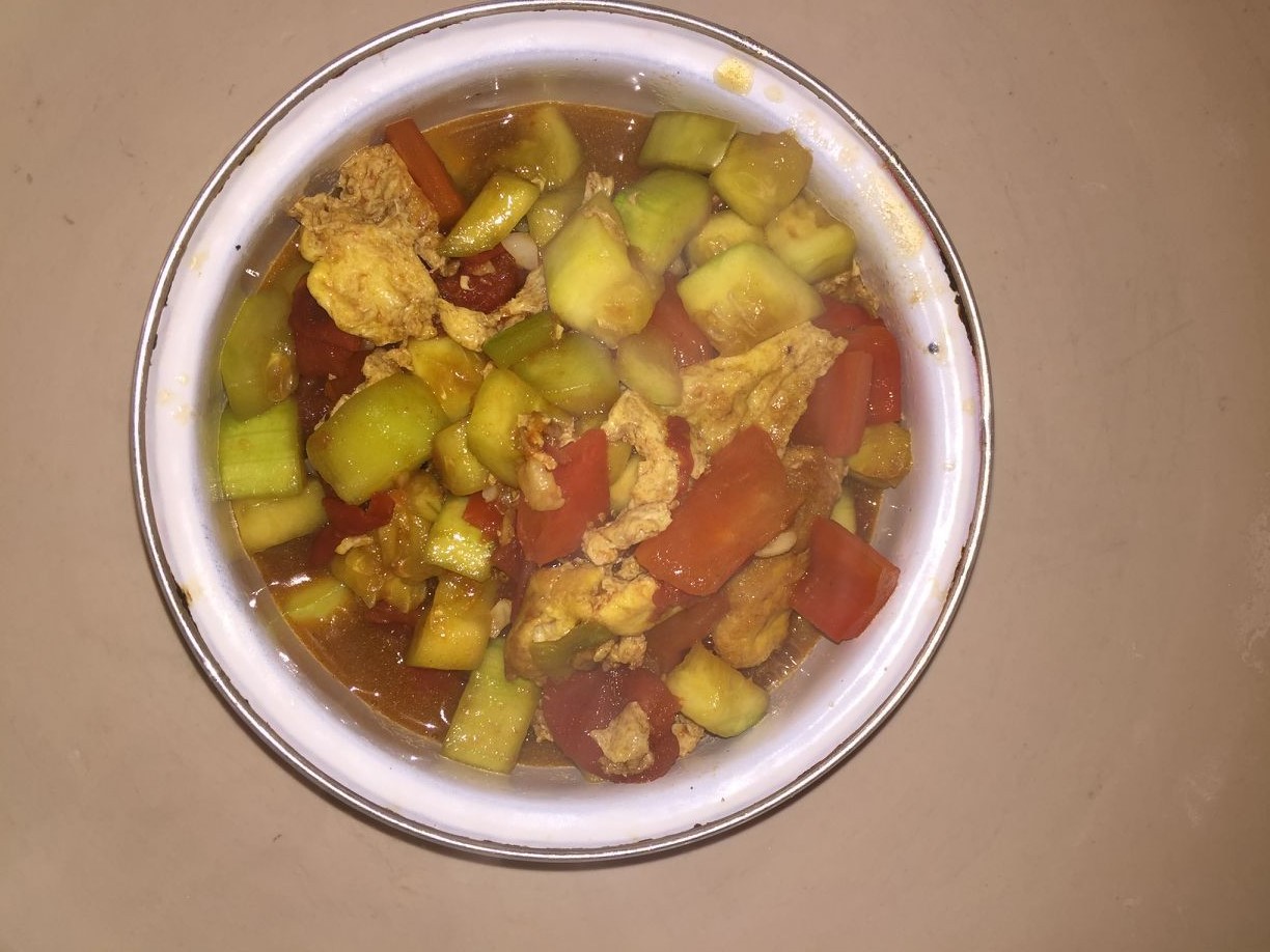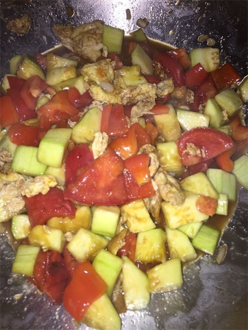 2、起锅热油,倒入打好的鸡蛋焯熟,好了之后,一边放入蒜末爆香,再倒入西红柿块,笋瓜块,加入适量盐,生抽继续翻炒入味;