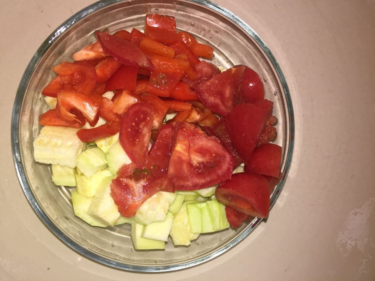 1、先将西红柿,笋瓜切块,碗中打两个鸡蛋;