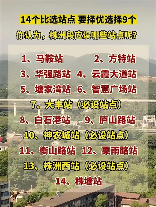 长株城际铁路株洲段项目,总投资约137亿元,长株城际铁路正线全长90.7公里,设站17座,株洲段内有40.3公里,计划设9个车站,目前必设车站有3个大丰站、神农城站、株洲西站,余下6个站,株洲正在征求市民设站意见。
