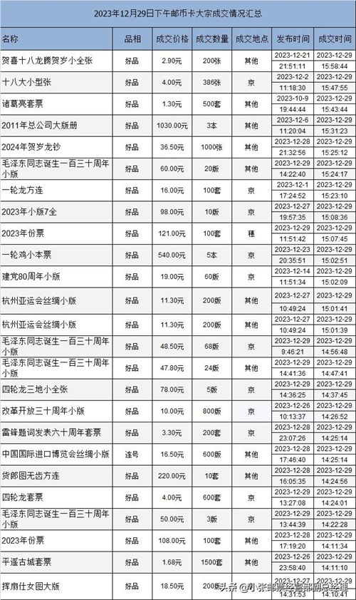 2023年12月29日邮币卡大宗成交情况汇总1