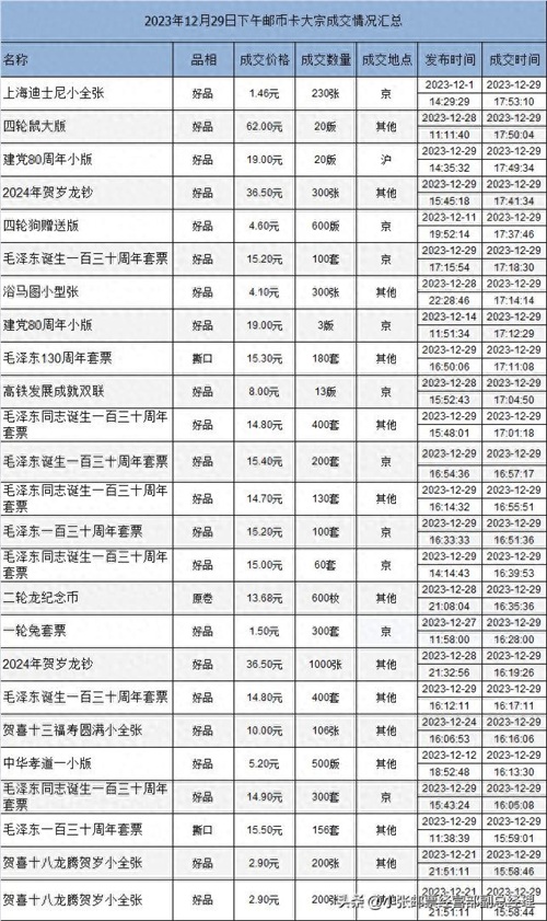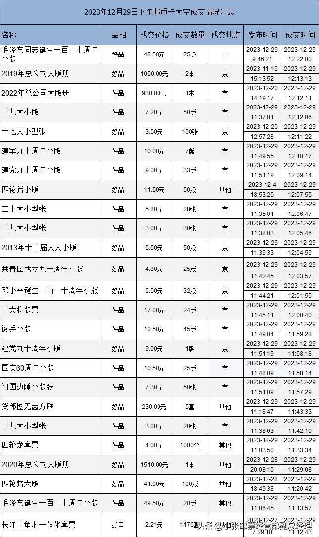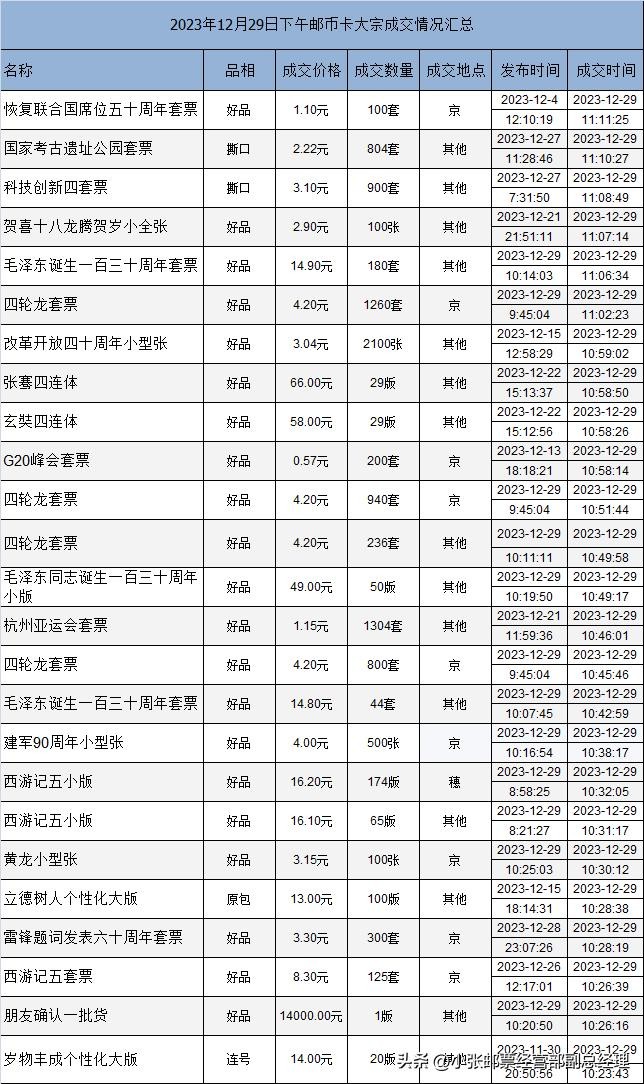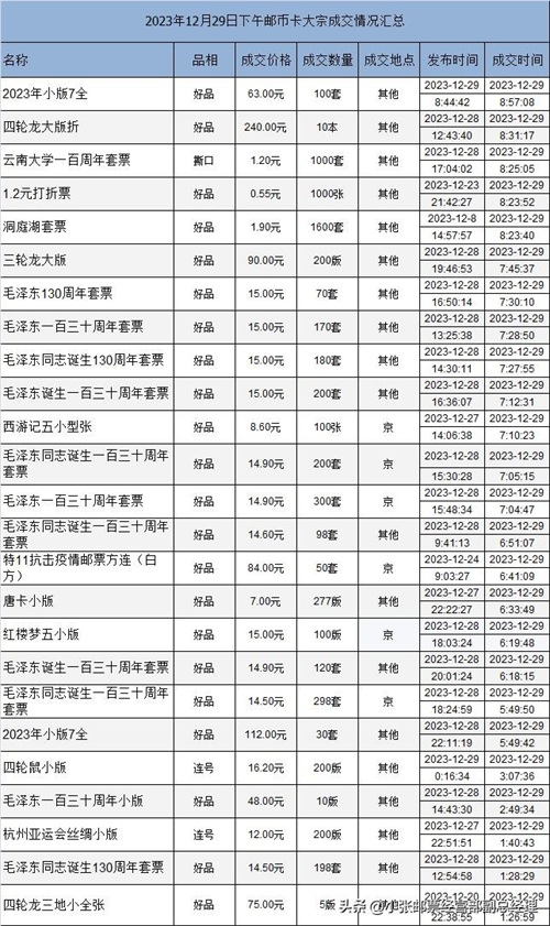 2023年12月29日邮币卡大宗成交情况汇总4