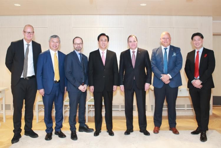 瑞典首相斯特凡·勒文(右三)见证签约并合影留念