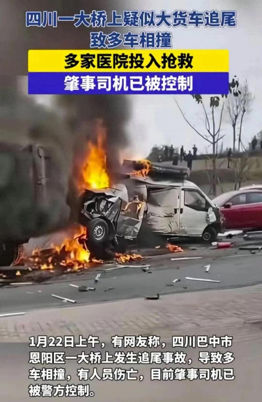 四川巴中恩阳区发生了一起严重的车祸事故。据了解,事故发生在1月22日(昨天)上午11点40分左右,一辆重型大货车突然失控,猛烈撞击前方正在等待红绿灯的车辆,现场情况十分惨烈。