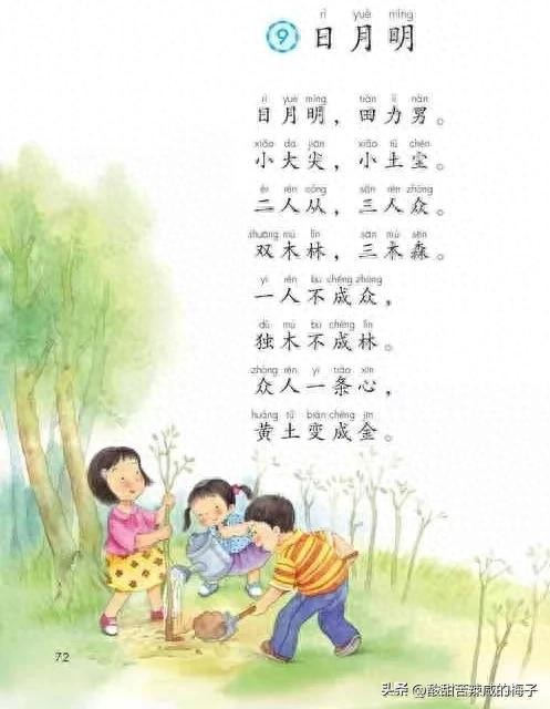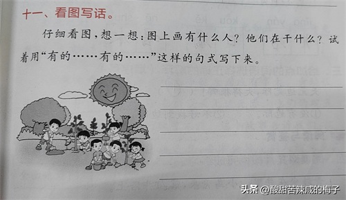小学一、二年级的看图写话,要充分利用好课文的插图进行训练。比如《植树》可以利用一年级的第九课《日月明》这幅图片来进行引导。