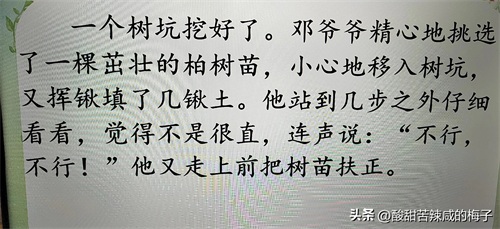 如教学列二年级上册《邓小平爷爷植树》,我引导学生抓住课文的好句:只见他手握铁锹,兴致勃勃地挖着树坑,额头已经满是汗珠,仍不肯休息。”一个树坑挖好了。邓爷爷精心地挑选了一棵茁壮的柏树苗,小心地移入树坑,又挥锹填了几锹土。他站到几步之外仔细看看,觉得不是很直,连声说:“不行,不行!”他又走上前把树苗扶正。