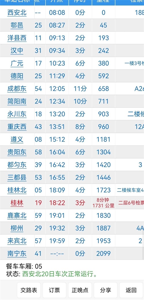 本次旅客列车正点从西安北始发,列车经由西成高铁南下,从此蜀道难不再难,经过鄠邑站,原名是户县,然后停靠洋县西,洋县属于秦岭自然保护区境内,拥有国家珍稀保护动物,朱鹮。之后抵达陕南汉中,汉中一片江南气息,油菜花盛开季节,西安局开行赏花专列。然后停到四川境内既有车站广元和德阳车站,渝贵铁路,兰渝铁路,宝成铁路交汇于广元站。12点抵到成都东站,停靠11分钟,沿着成渝铁路抵达重庆西站,山城重庆,轨道交通发达,拥有网红地铁站,李子坝站。地铁从居民楼下穿楼而过。经过遵义,遵义红色资源丰富,改变中国革命历史进程的遵义会议就是在这里举行的,然后抵达贵阳东站,然后停靠桂林北,桂林站。桂林山水甲天下,尤其是象鼻山和鱼排上的蓑翁老人。自然还有印象刘三姐大型实景演出。过柳州,柳州螺蛳粉比较出名。