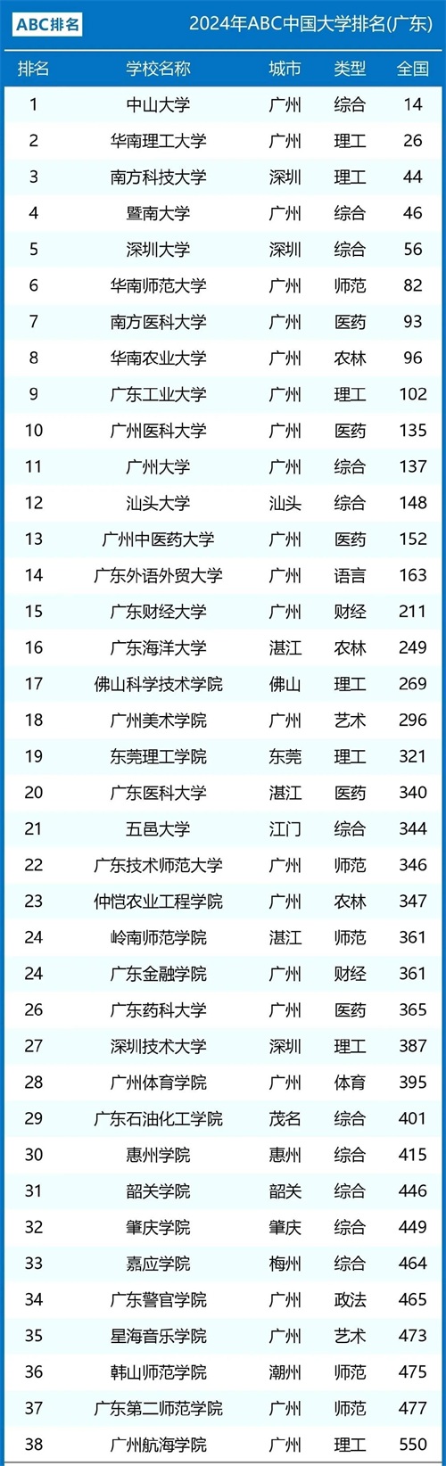 2024年广东省38所大学排名:中山大学第1,深圳大学第5,汕大第12