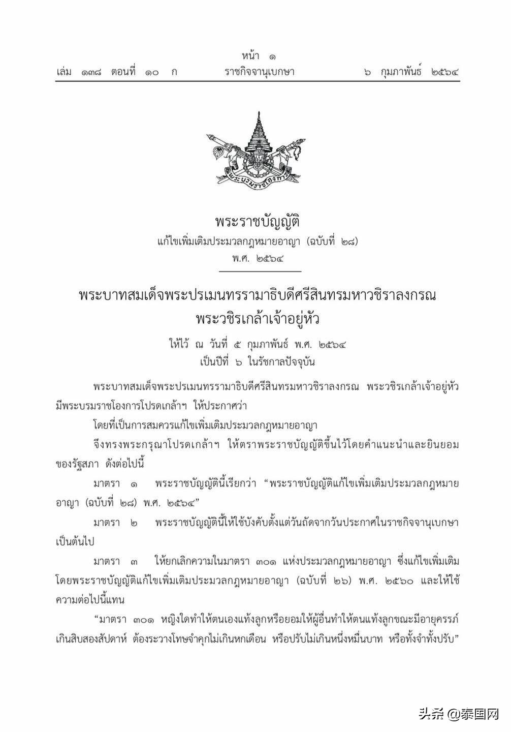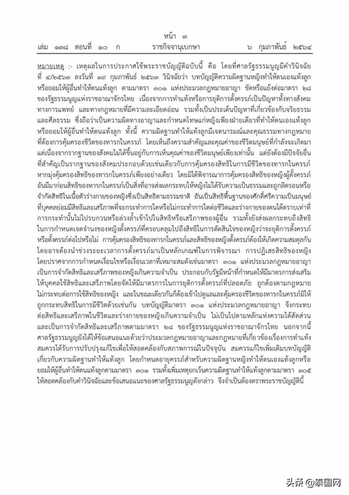 泰国网报道,2020年11月中旬,泰国总理府副发言人拉查妲宣布内阁会议通过了《刑法》中堕胎条例的修正案。2021年2月6日,泰国政府公报网站正式发布官方文件,宣布新修版堕胎法正式生效,允许怀孕不超过12周的女性堕胎。该份公告文件内容大致如下: