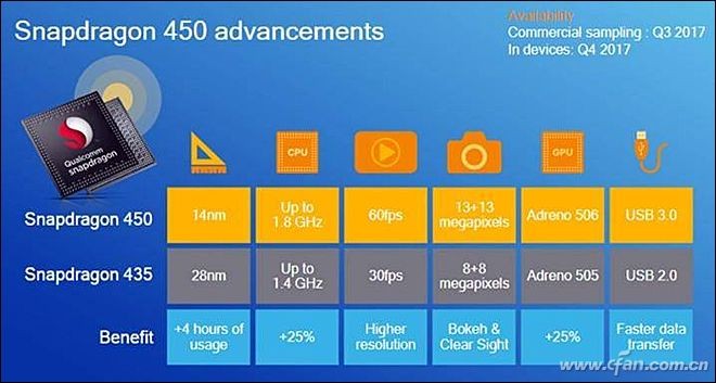 在大家关心的GPU方面,骁龙450集成了Adreno 506 GPU。看着很熟悉?没错,骁龙625集成的也是这颗GPU,结合整体参数来看,我们可以将骁龙450理解为降频版的骁龙625。
