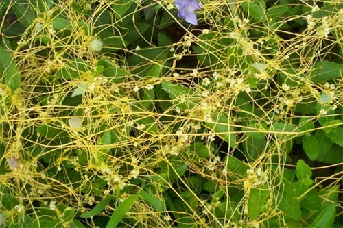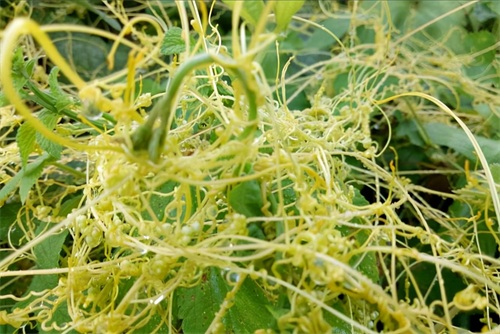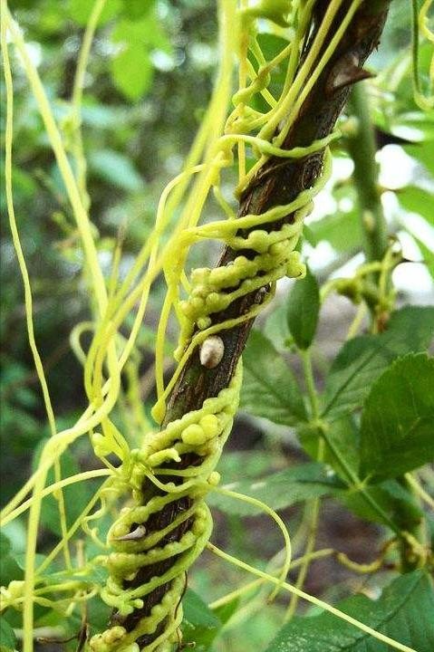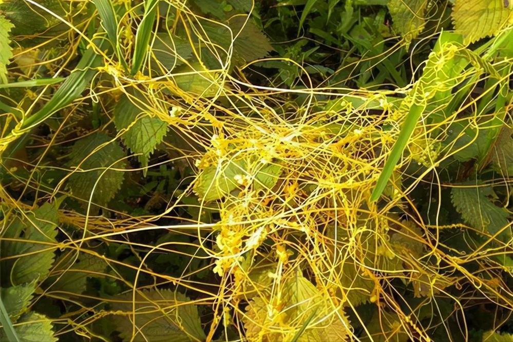 无根草学名菟丝子,农村的田间地头很常见的一种野草。它对其他农作物有一定的危害,因其本身没用根系,并不是从土壤中吸取营养,而是吸附寄生于其他植物的枝叶上获取营养生长。所以农民很是讨厌它,时常进行清理。