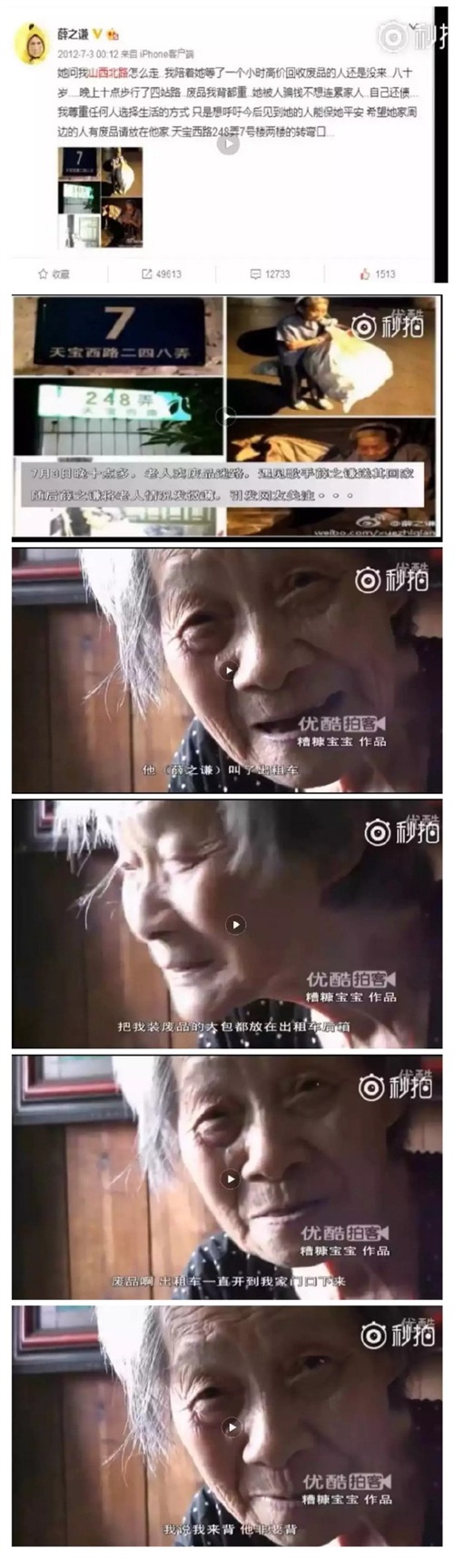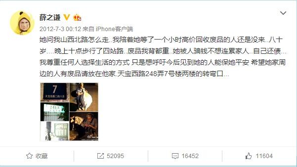 这是2012年7月3日薛之谦发的微博。路遇拾荒老人的薛之谦给予了老人帮助,同时呼吁大众对老人伸出援手。