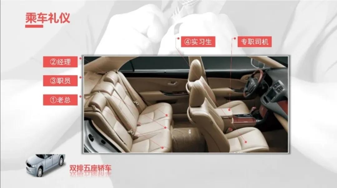 4.当有专职司机开车,且只有领导和秘书两人坐车时,领导通常坐在后排右侧的座位,秘书坐在领导的左边或副驾驶的座位。这与道路行驶规则有关,因为右边比左边上下车方便。训练有素的司机开车到目的地,后排右座一定正对着门。坐在这个座位上的人伸腿下车、抬腿上车都非常方便。