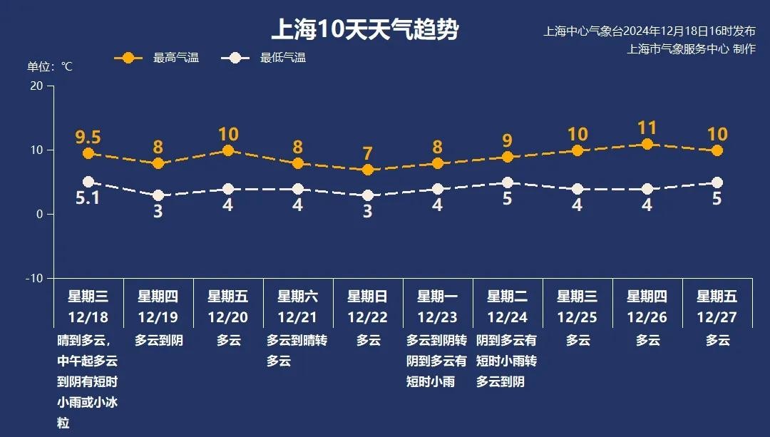 冷空气影响还将持续。受冷高压影响,明日(19日)继续降温,多云天气,全天保持在3℃~8℃,周五气温稍许回升至10℃。新一波冷空气将于周末到访上海,周日迎来本周最低温,全天在3℃~7℃,大家注意添加衣物。