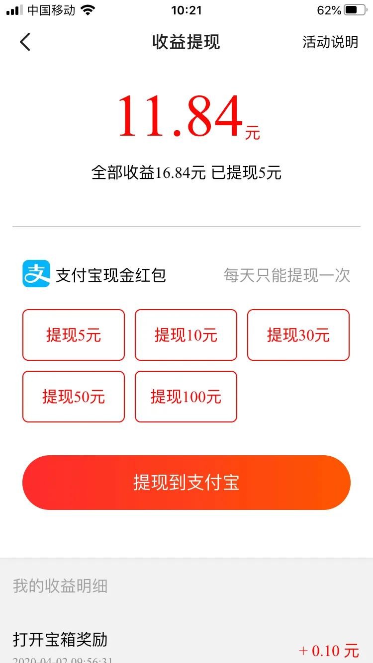 每天开下宝箱,阅读些文章,能换金币,这个提现比较慢,就当阅读了,当然想提现1元还是没啥难度的