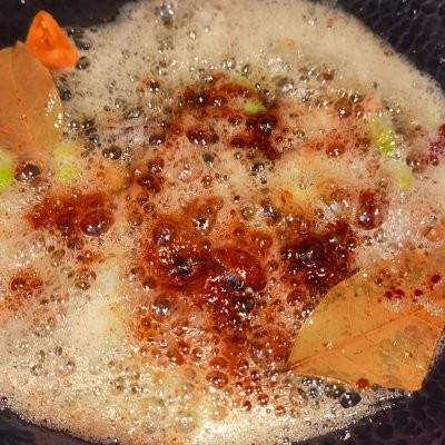 3、起锅烧油,然后放入冰糖,小火慢熬糖色,熬至糖色变成红褐色的时候,放入八角,桂皮,香叶,葱,姜,蒜,翻炒出香味,然后在放入料酒,蚝油,盐,鸡精,料酒,冷水备用