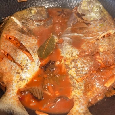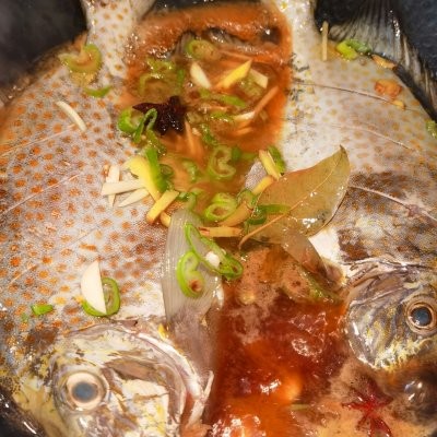 4、调料放进去之后把已经腌制好的臭肚鱼放入锅中,小火慢炖,冷水沫过鱼即可。
