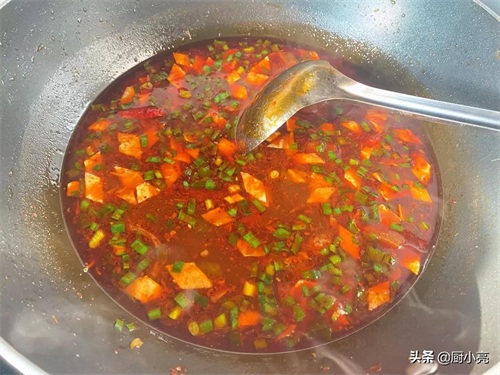 锅中放油,油热之后放入辣椒面炒香,然后放入香醋炝锅(这是关键的一步,醋受热熬出来的汤会很香)